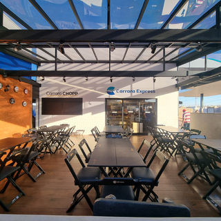 Para otimizar o espaço, foram implementadas soluções criativas, como a integração do balcão de chopp com abertura para a varanda e a cozinha. Além disso, o balcão do caixa foi estrategicamente posicionado com uma abertura para o posto, facilitando o fluxo de clientes e o acesso aos produtos.