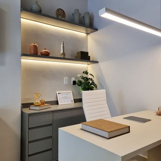 A área de atendimento clínico equilibra funcionalidade técnica com elegância decorativa. O mobiliário planejado integra armários em tons de cinza grafite com nichos superiores em madeira, todos destacados por fitas de LED que garantem uma iluminação funcional e cênica. O uso de ripados de madeira e uma mesa de atendimento com design clean permite que o profissional realize consultas e procedimentos em um ambiente organizado, onde a tecnologia dos equipamentos odontológicos de ponta convive harmoniosamente com objetos decorativos e certificados expostos com curadoria.